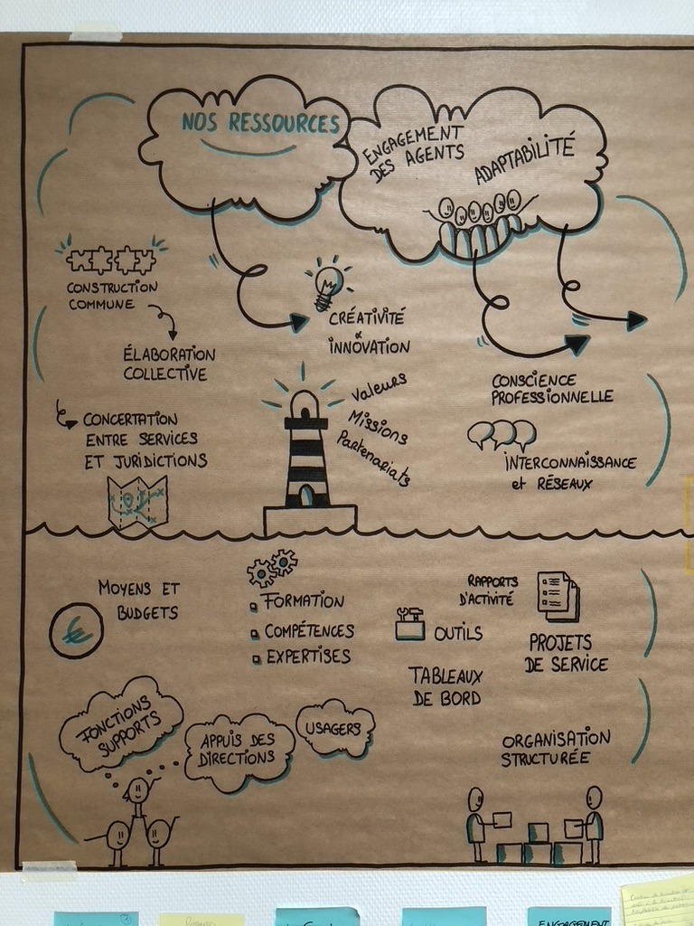 Suite à un temps d'échanges, j'utilise la facilitation graphique pour retranscrire les moments forts ou les enseignements clés. Il s'agit ici de créer une synthèse visuelle ou synthèse graphique. Elle mêle mots-clés et dessins, et permet de garder une trace plaisante des échanges tout en facilitant la compréhension et la mémorisation.